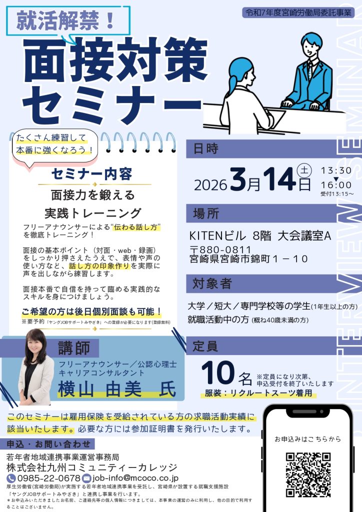 厚生労働省(宮崎労働局)が実施する若年者地域連携事業を受託し、宮崎県が設置する就職支援施設「ヤングJOBサポートみやざき」と連携し事業を行います